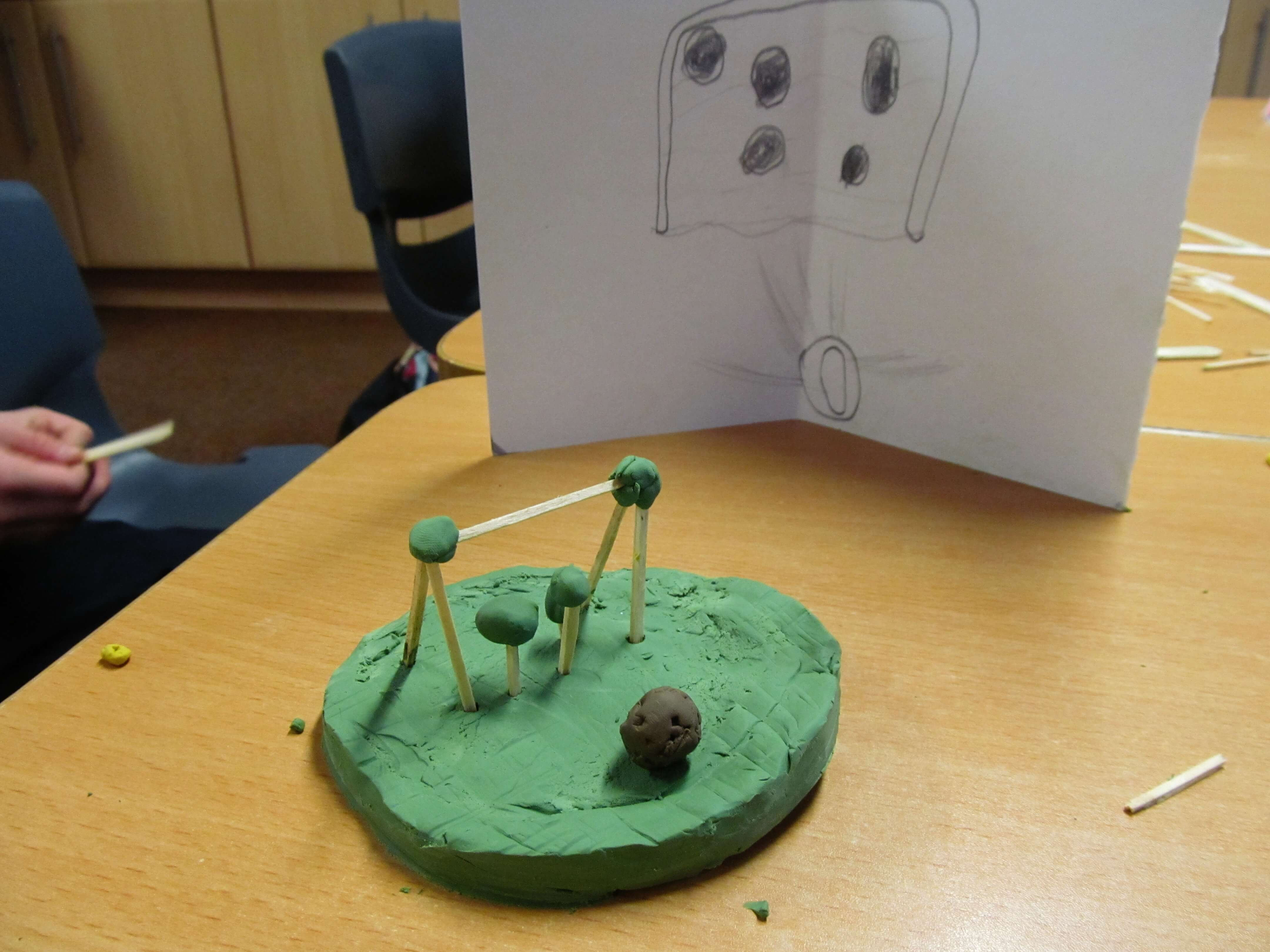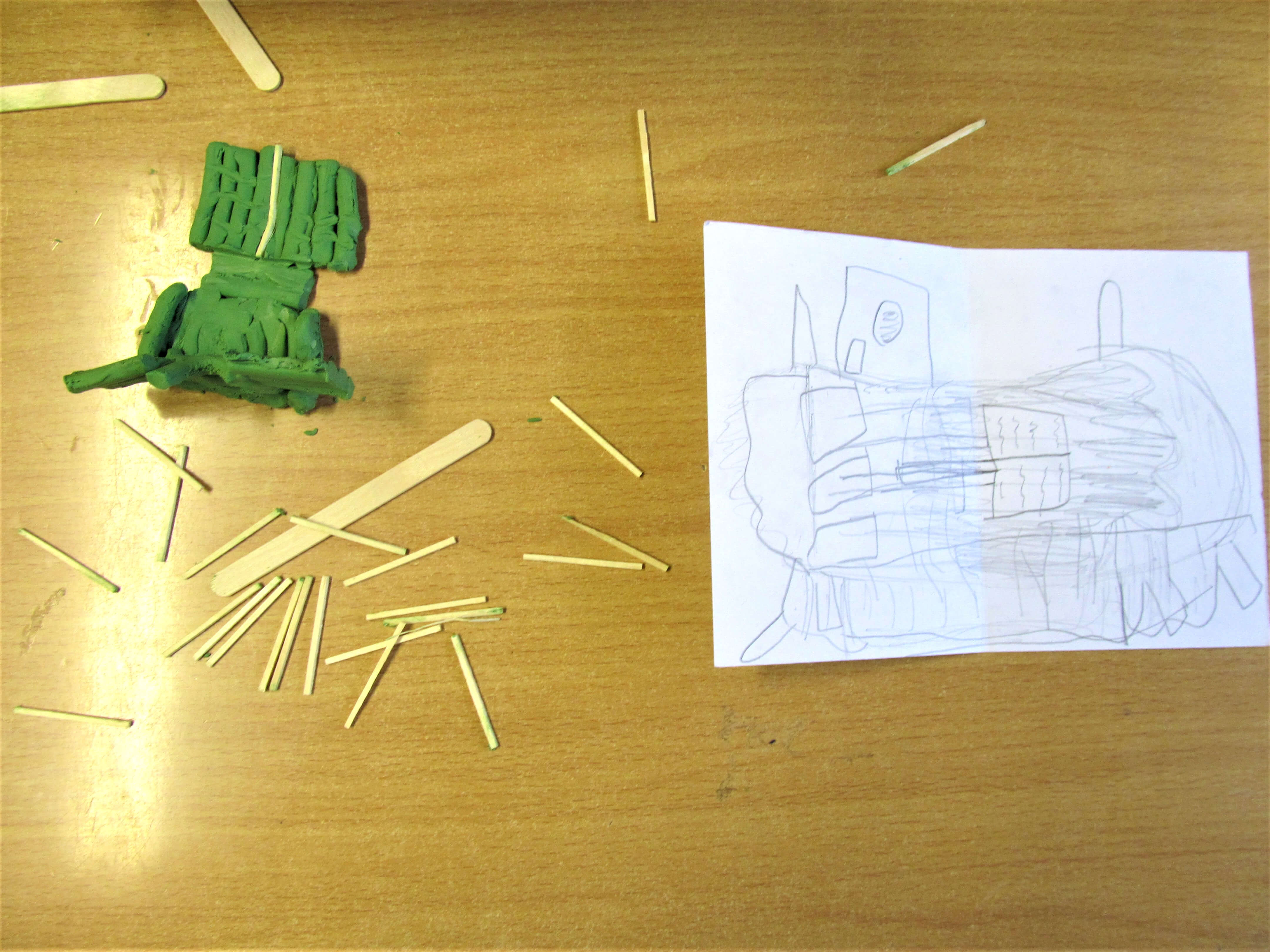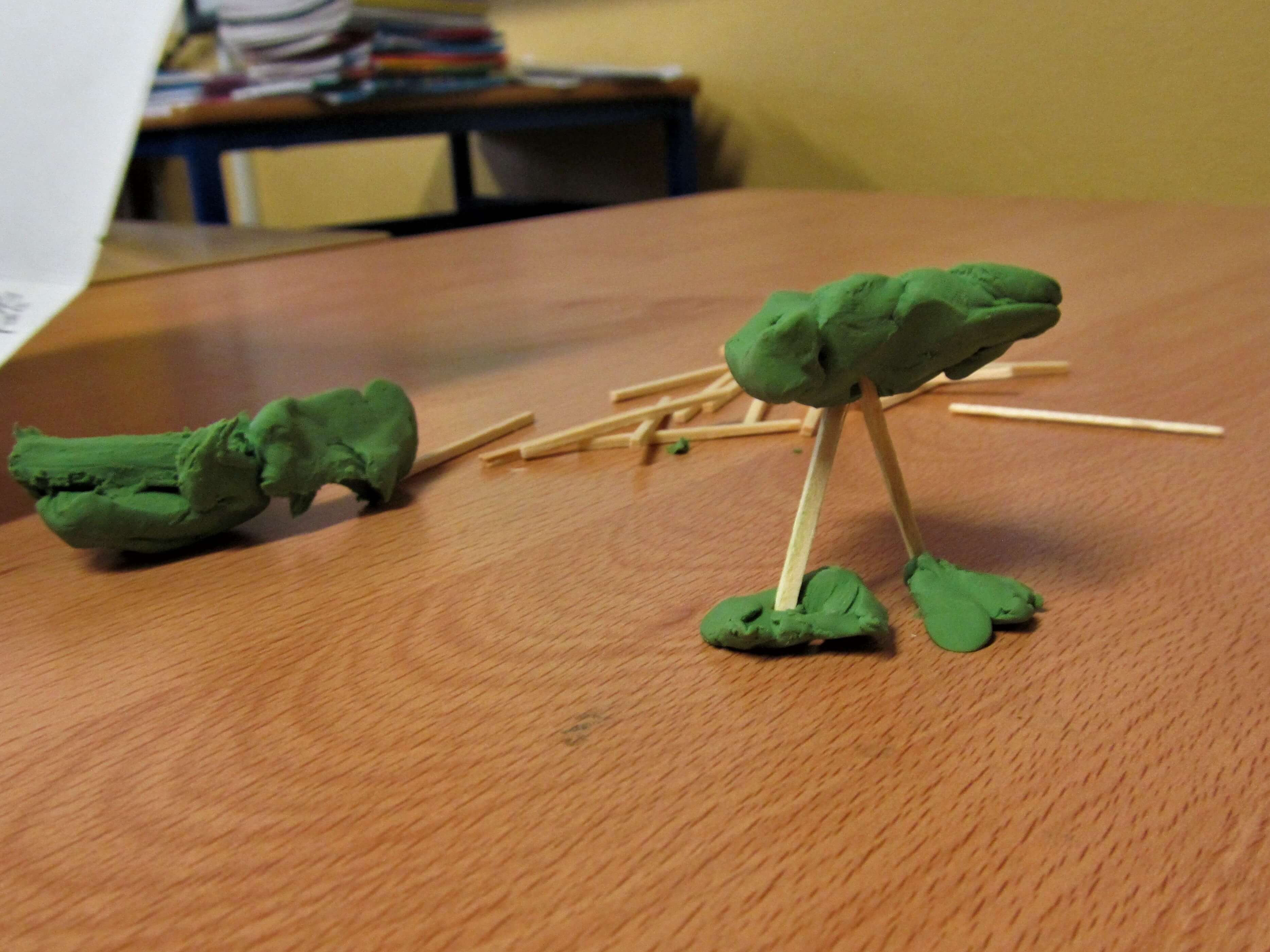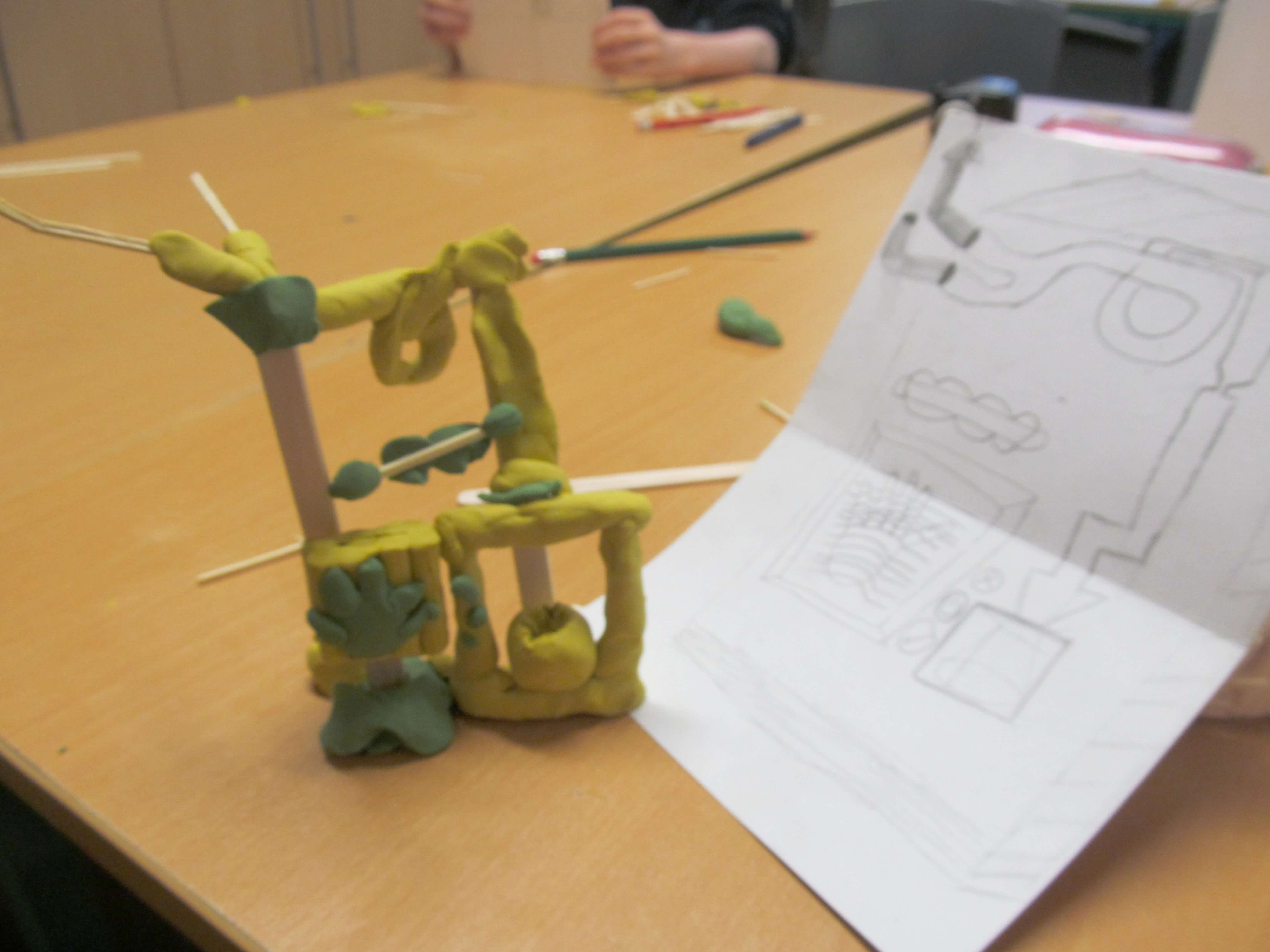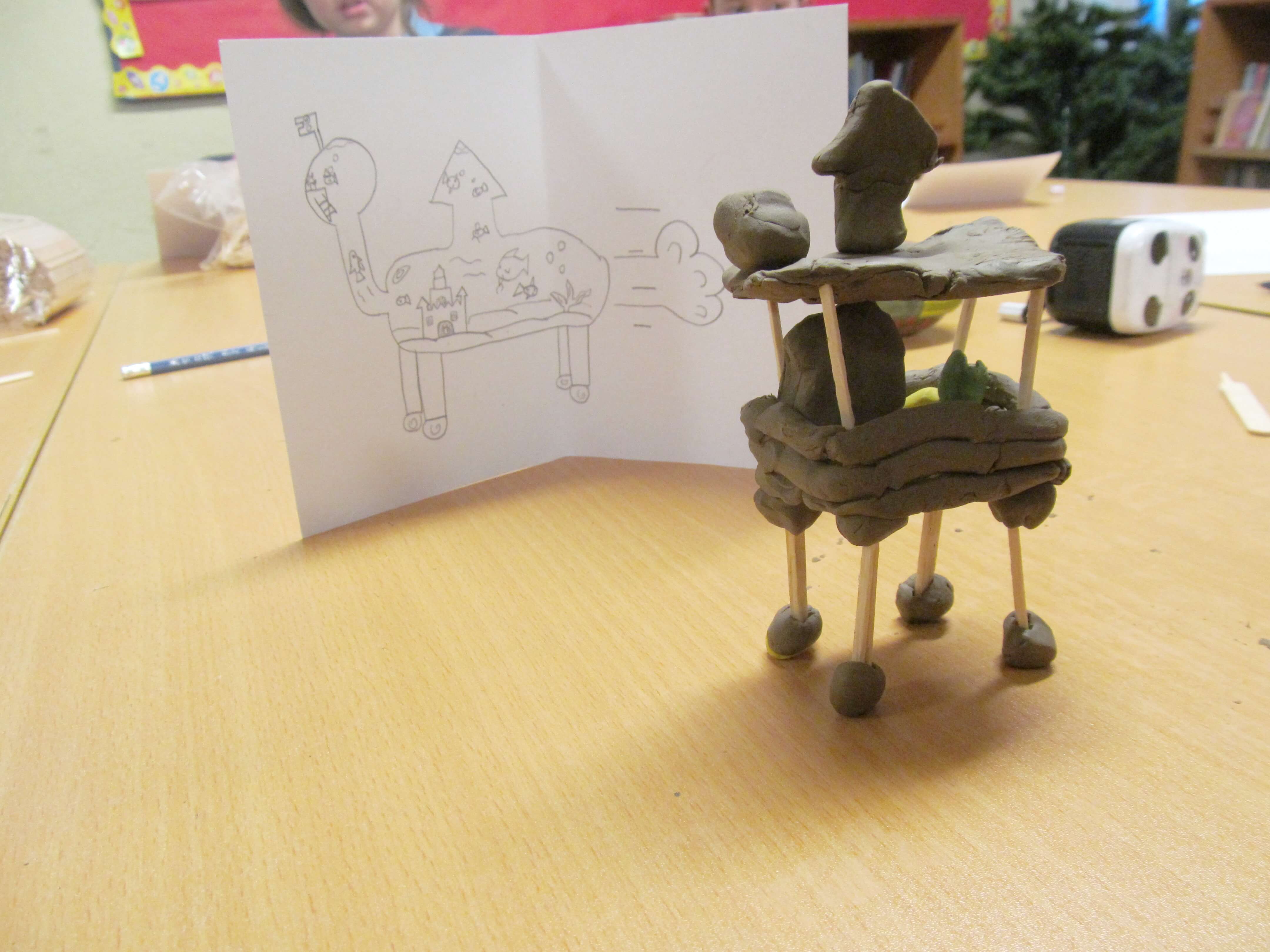We used simple materials: plastiscine, matchsticks and lollipop sticks to focus on the form of the sculptures, trying to represent the integrity of the drawings and the fantastic forms.