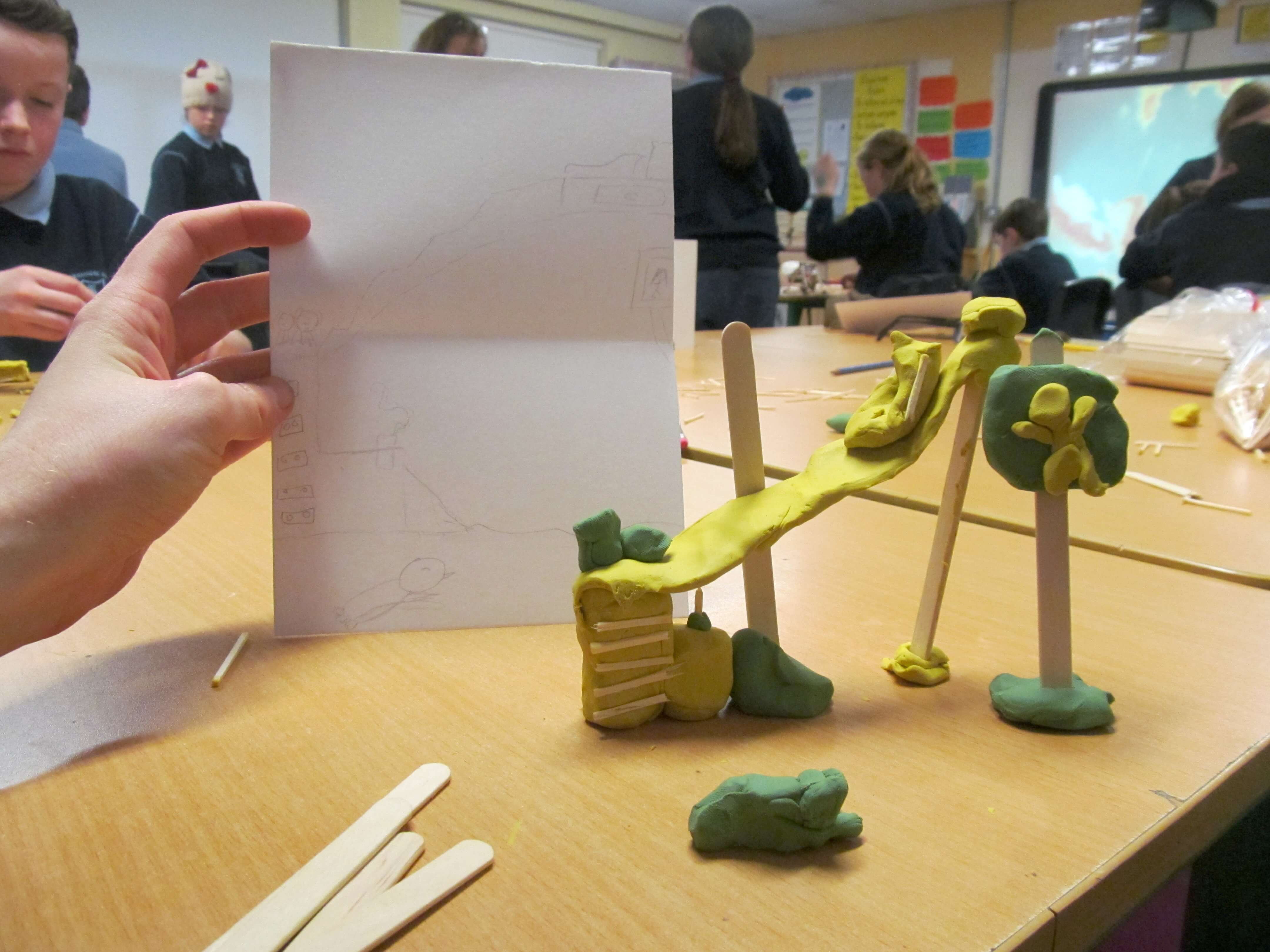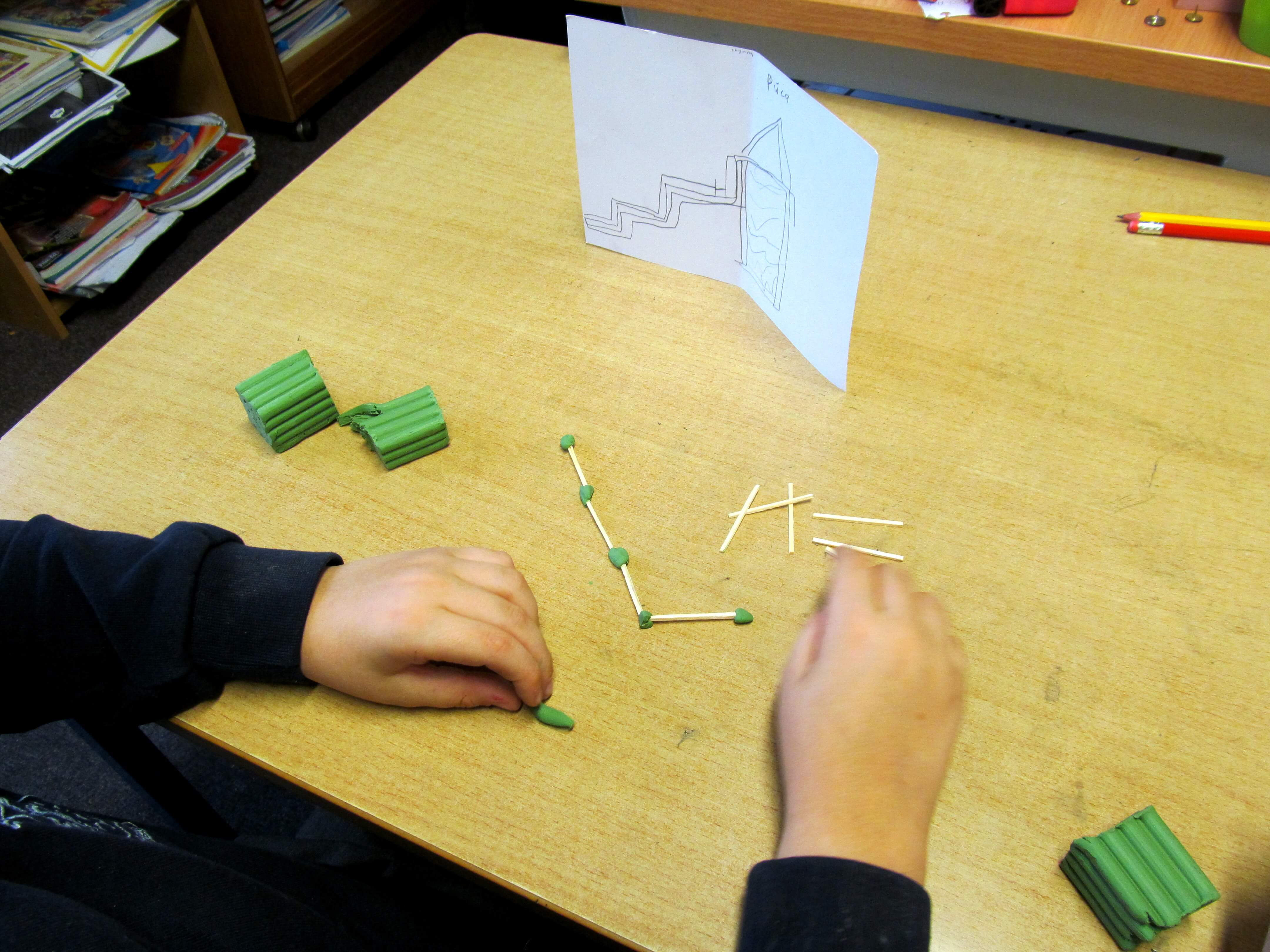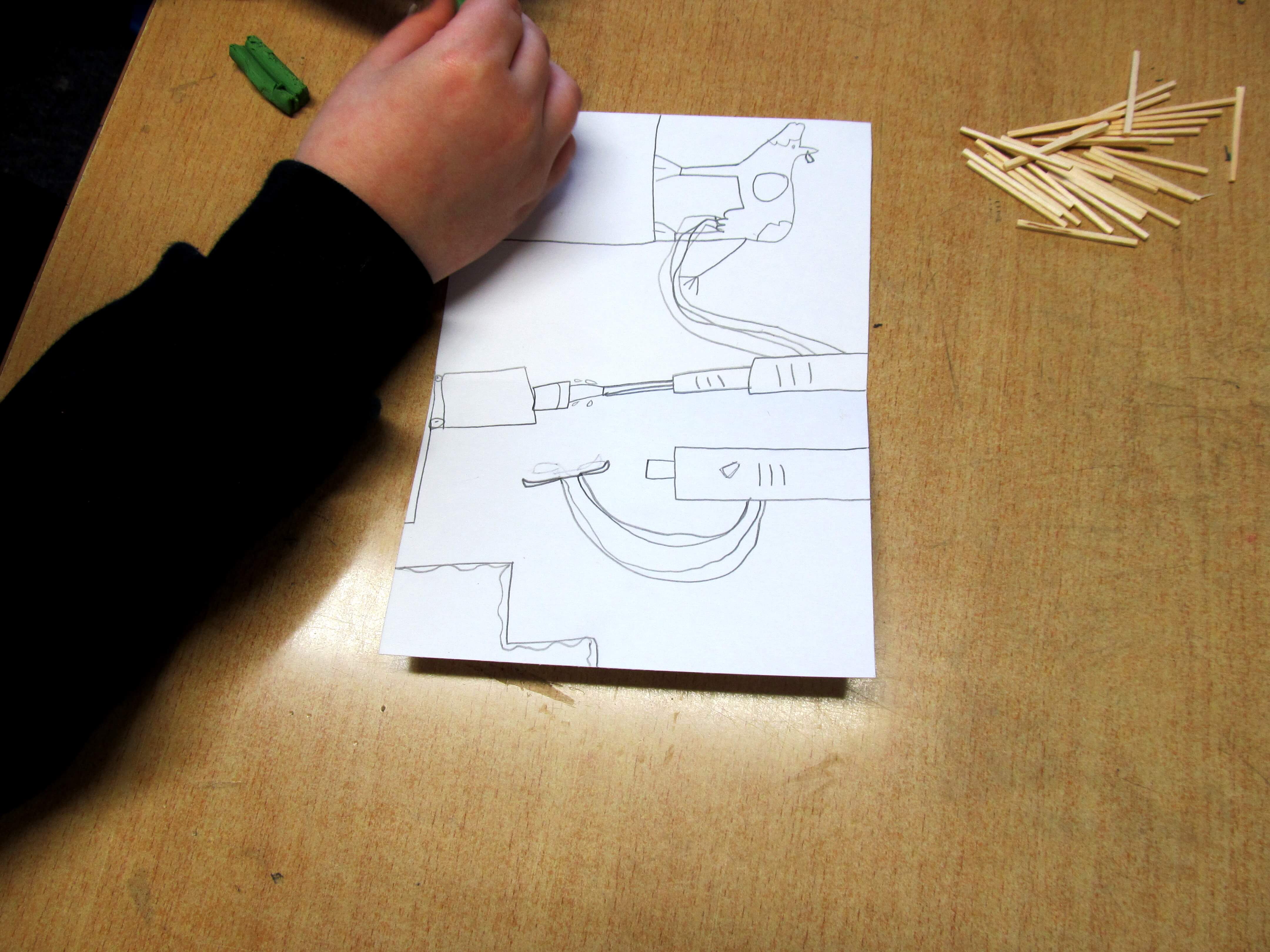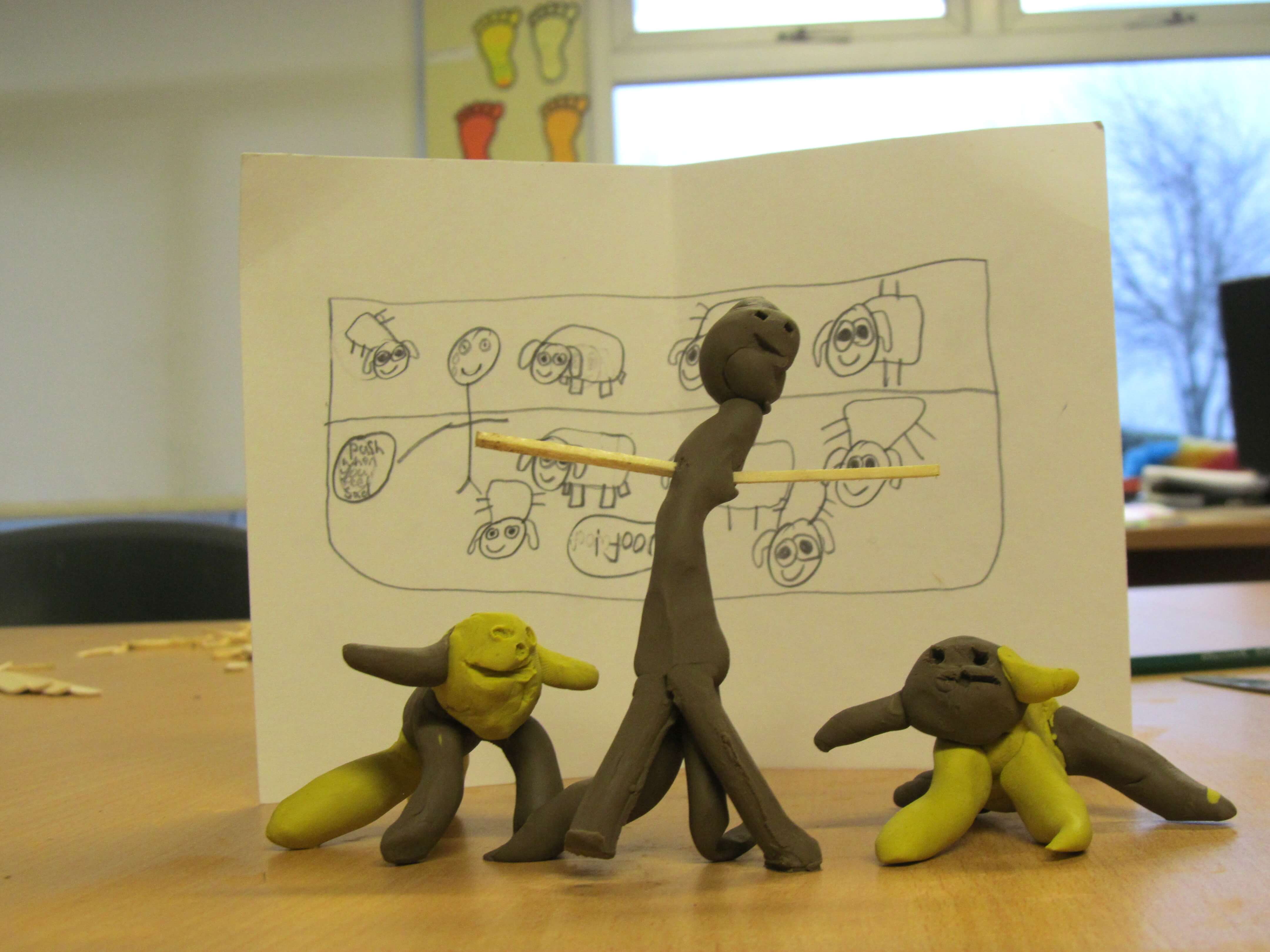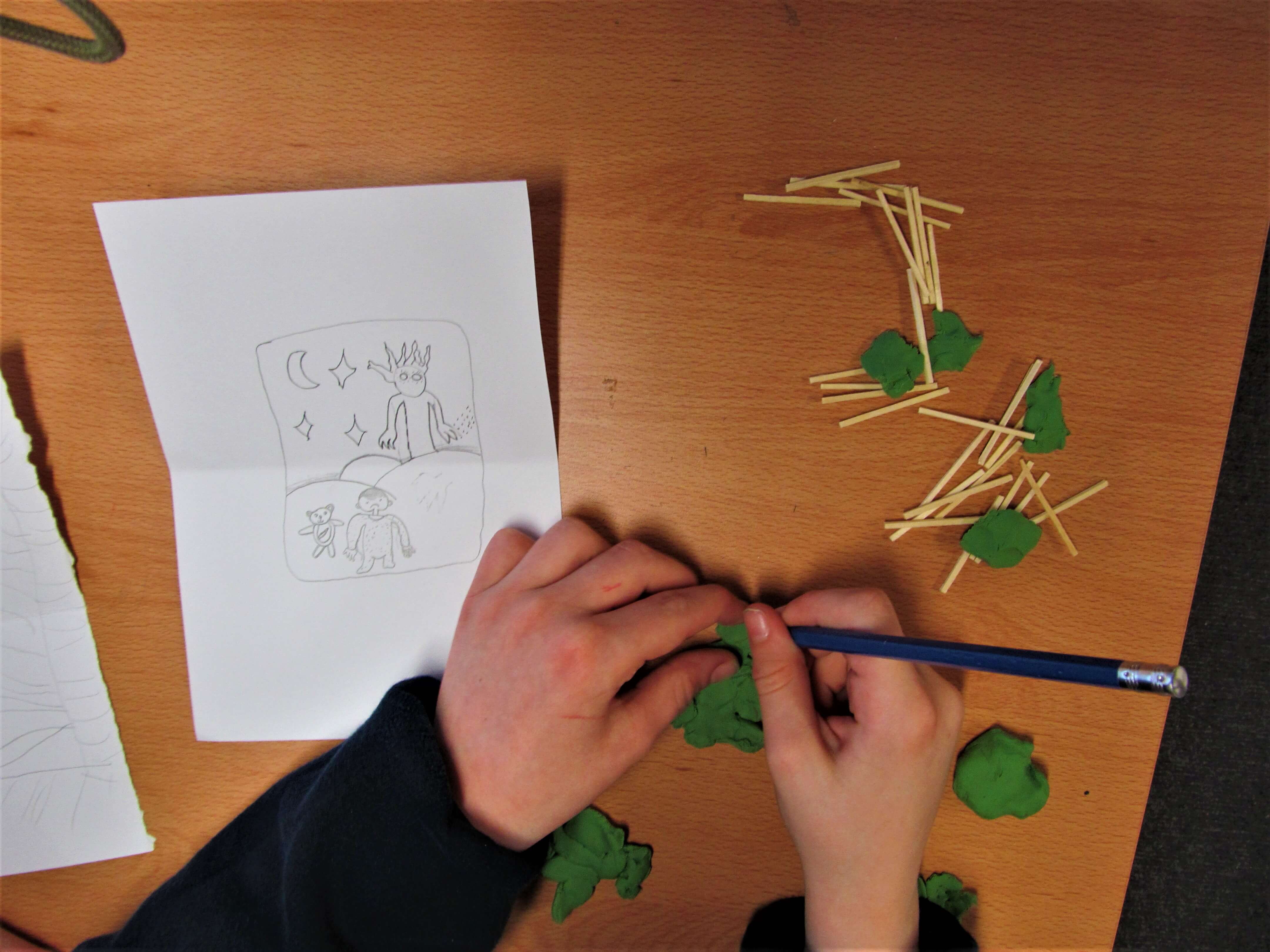 We used simple materials: plastiscine, matchsticks and lollipop sticks to focus on the form of the sculptures, trying to represent the integrity of the drawings and the fantastic forms.