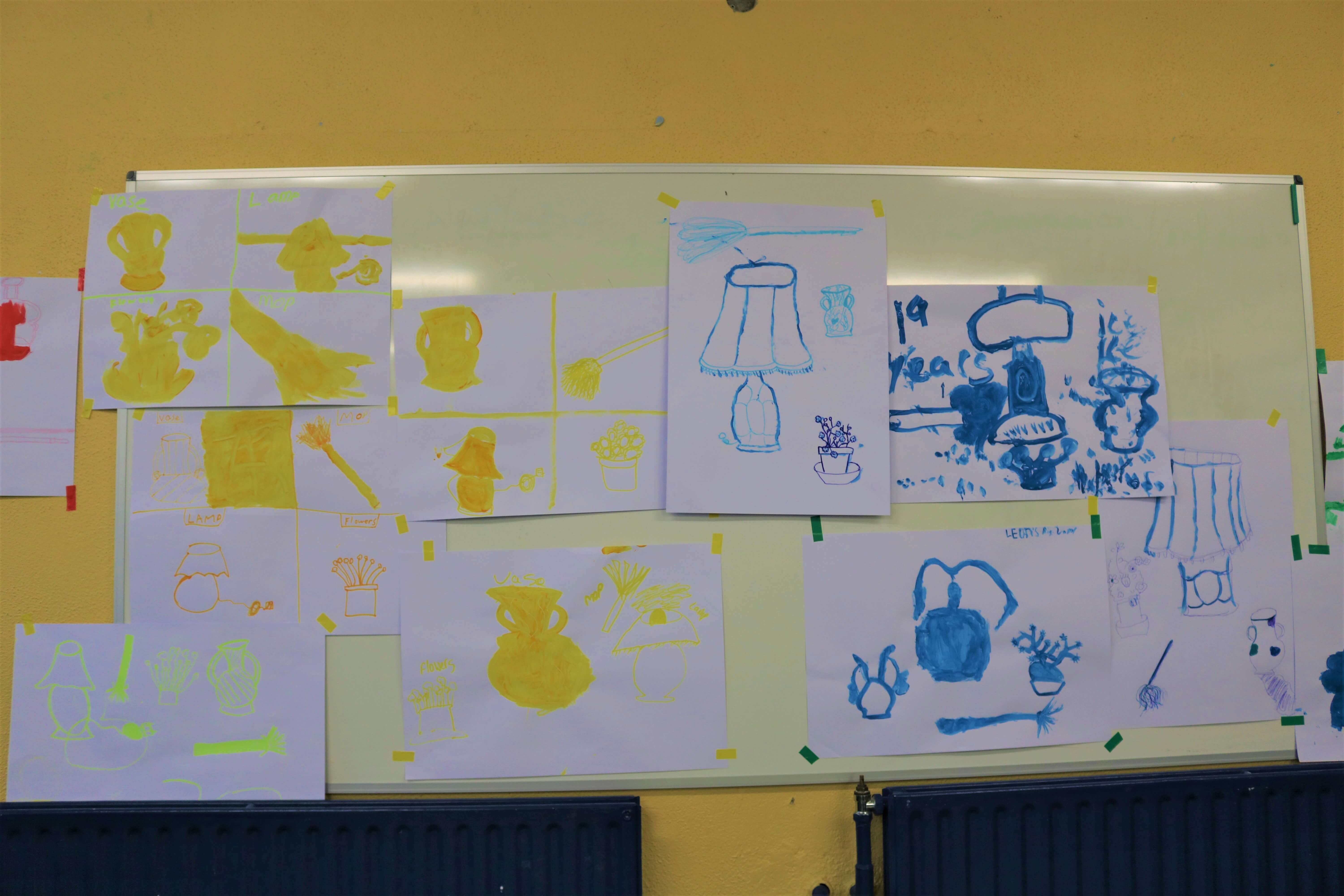 The class were split into teams - the blue, yellow, red and green teams. When they had collectively brought their associations for each colour together they painted four household objects, a mop, a plant, a vase and a lamp. Thinking of how simple Hannah's sculptures often look, they tried to represent the objects through a few simple characteristics, thinking of what is essential to include if they want to recognise each object.
