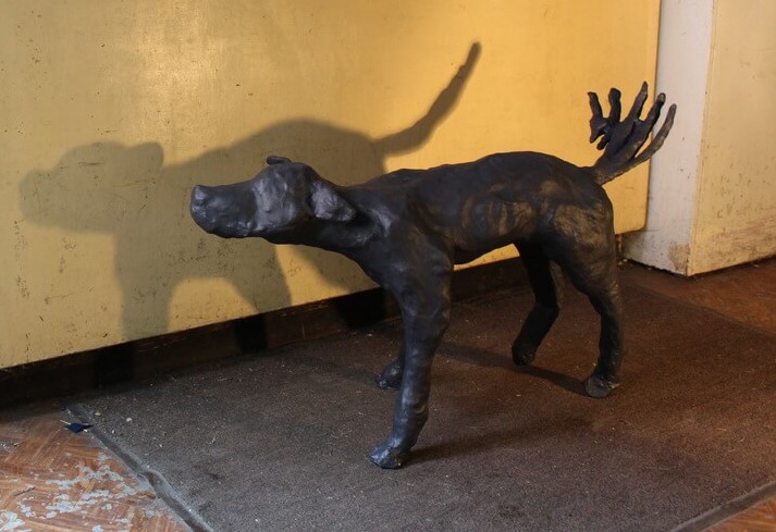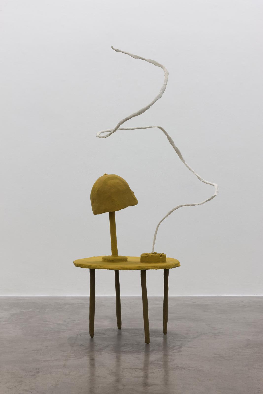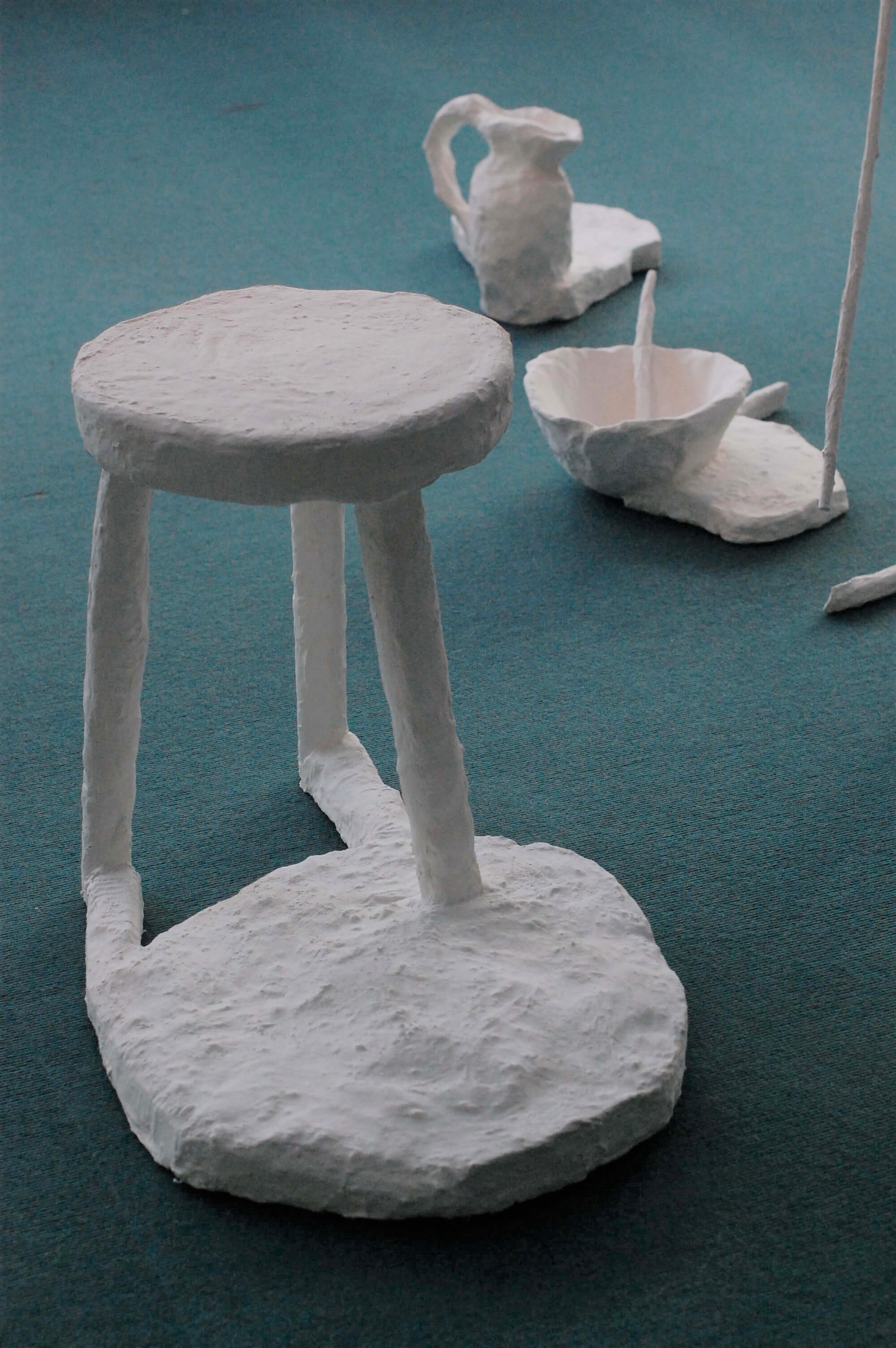 Sometimes it is like a room of Hannah's sculptures are all pretending to be real objects in the world, but they look like drawings of objects! Imagine if the sculpture is pretending to be a stool, but the sculpture doesn't know where the stool begins and ends. So the sculpture thinks the stool is also the shadow of the stool and it looks like this.