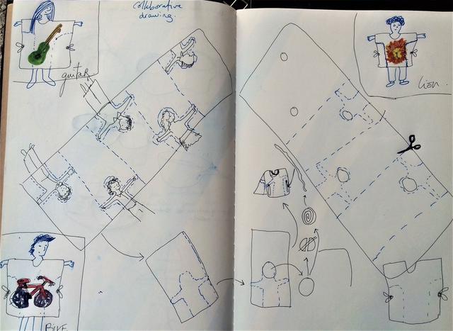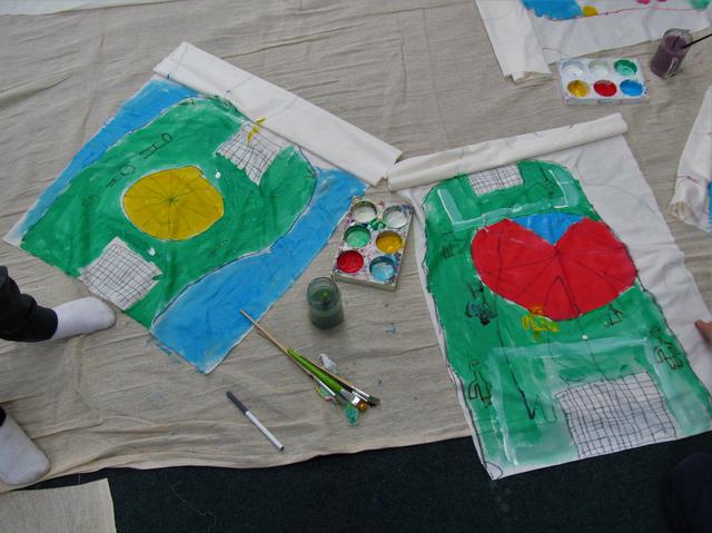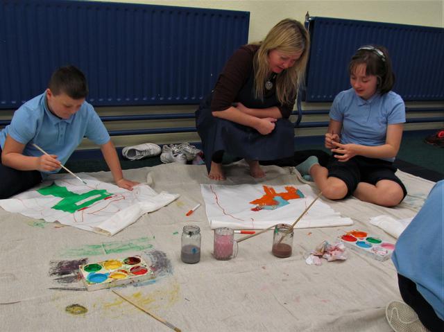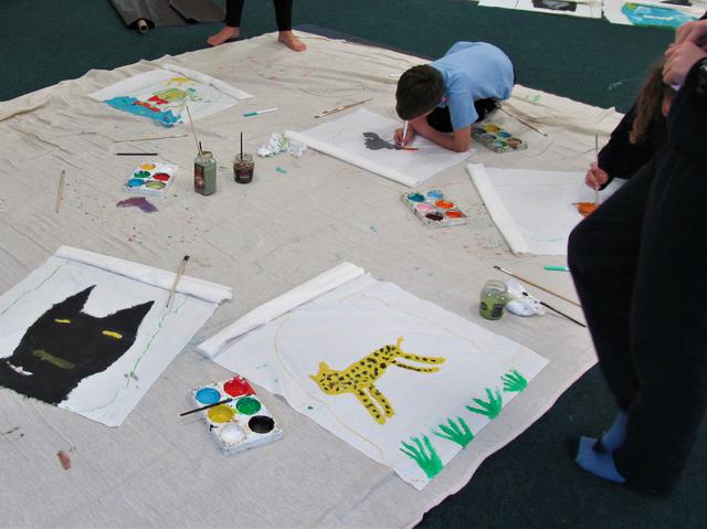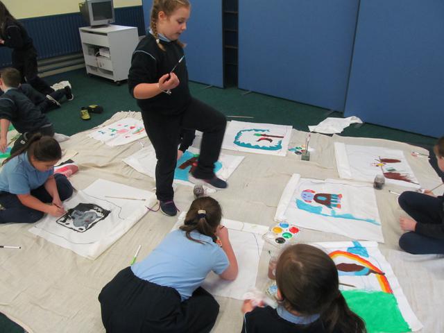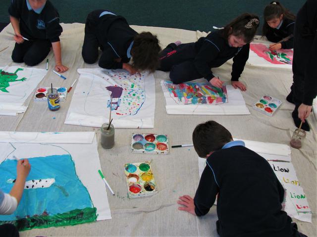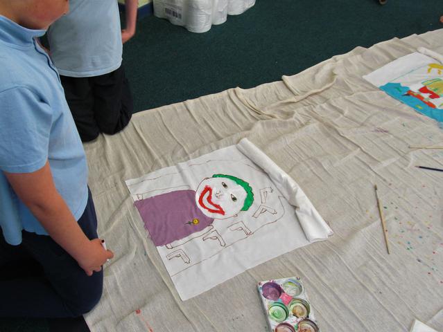 This question proposes an alternative introduction that is not based on nationality, age, gender etc. it leaves space for improvisation, allowing us all to introduce ourselves on our own terms. Working collaboratively the children drew around one another while lying on the ground to find their shape, the traced figure became the outline for a tunic. Each child then painted the animal/ object/ monster/ alien they had selected on the tummy of their tunic to wear over their uniform for the coming weeks.