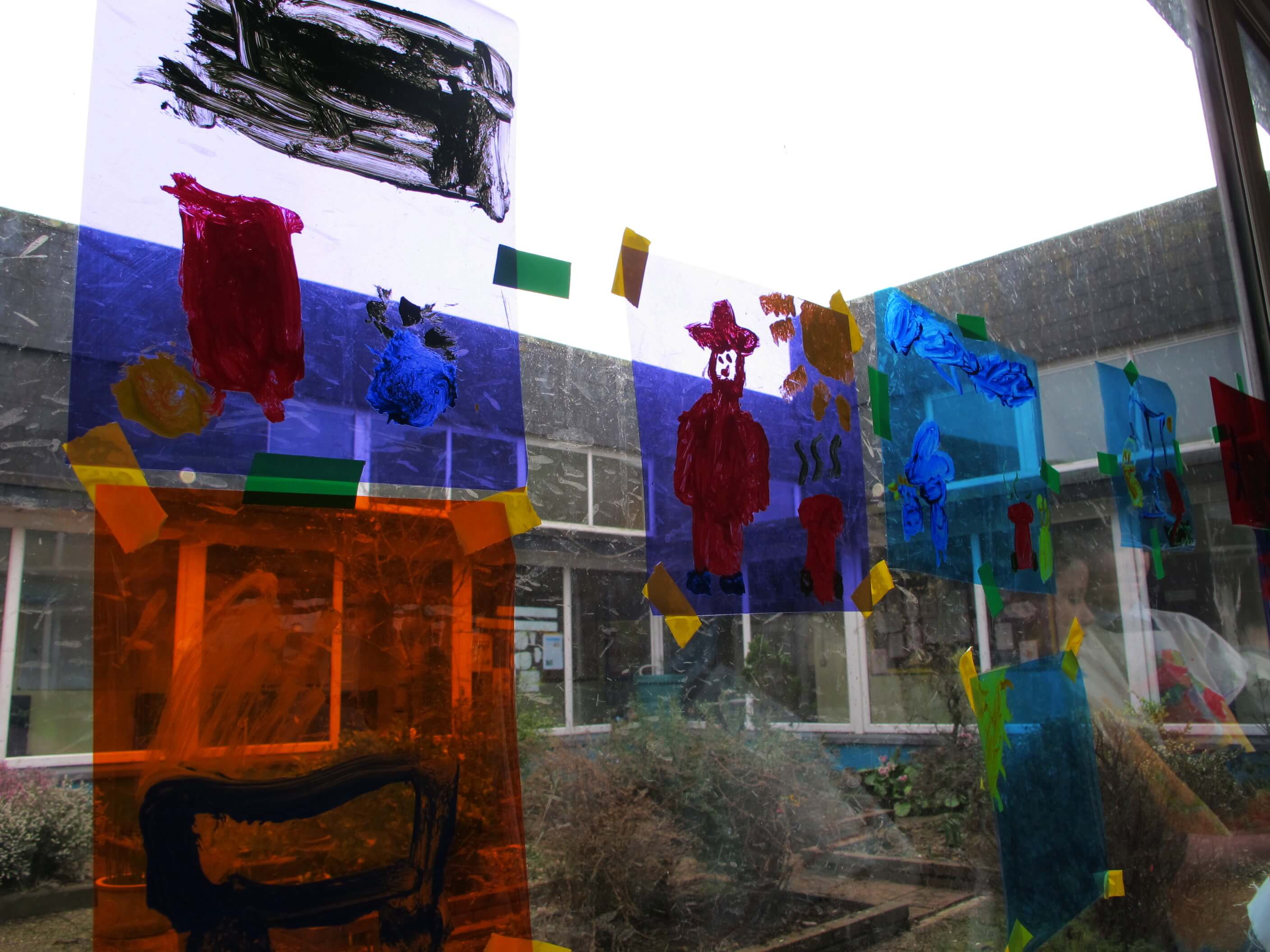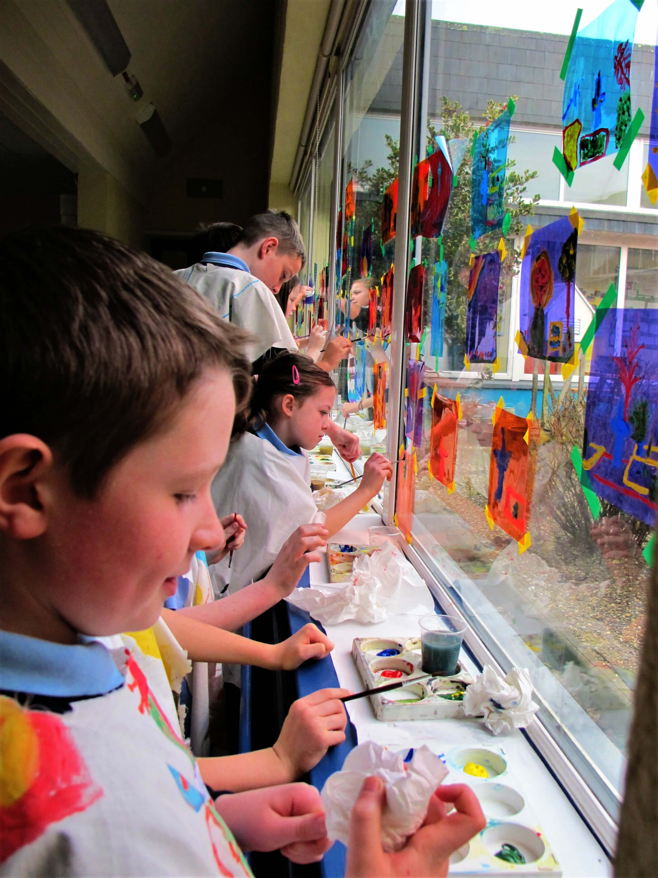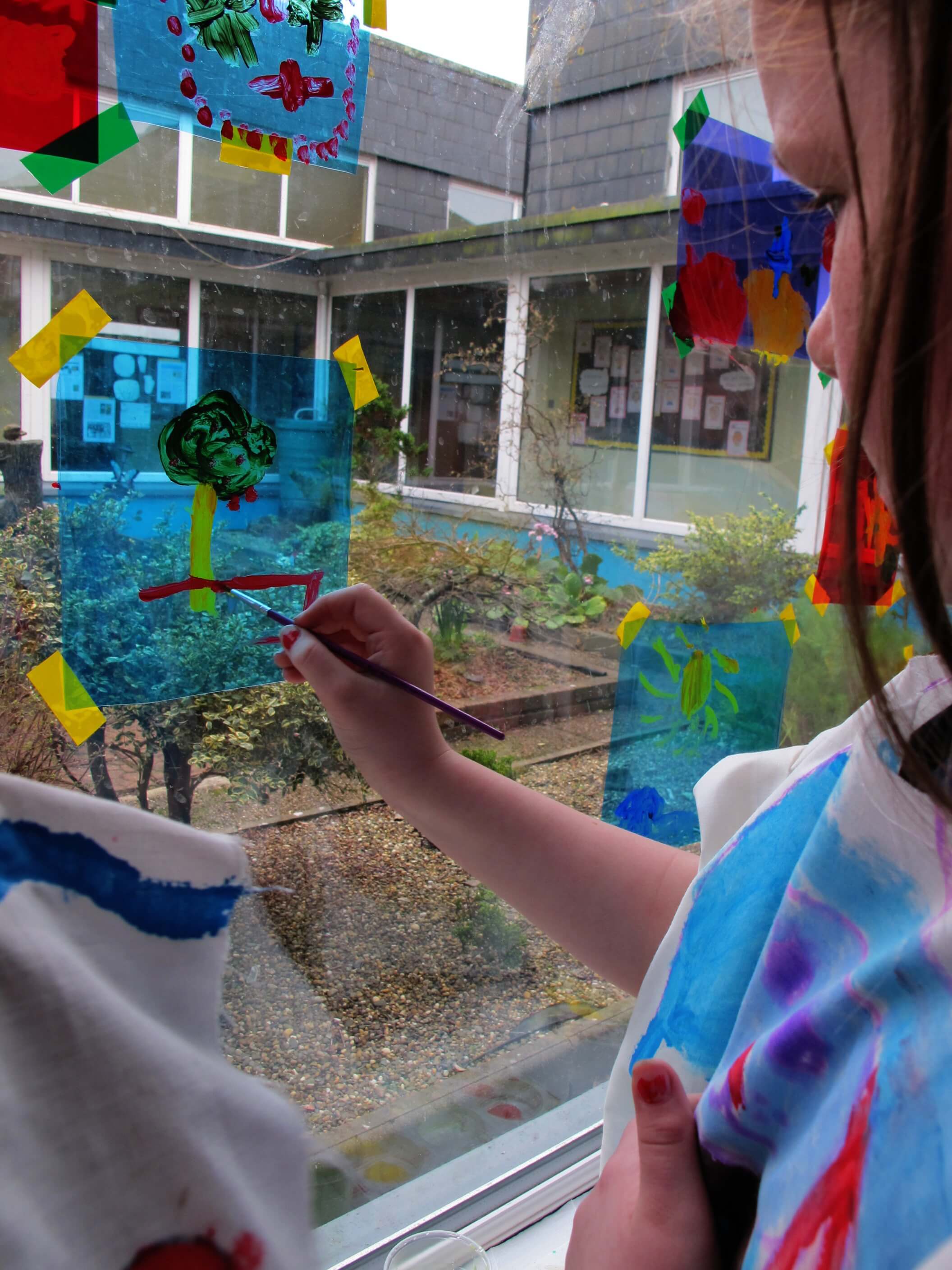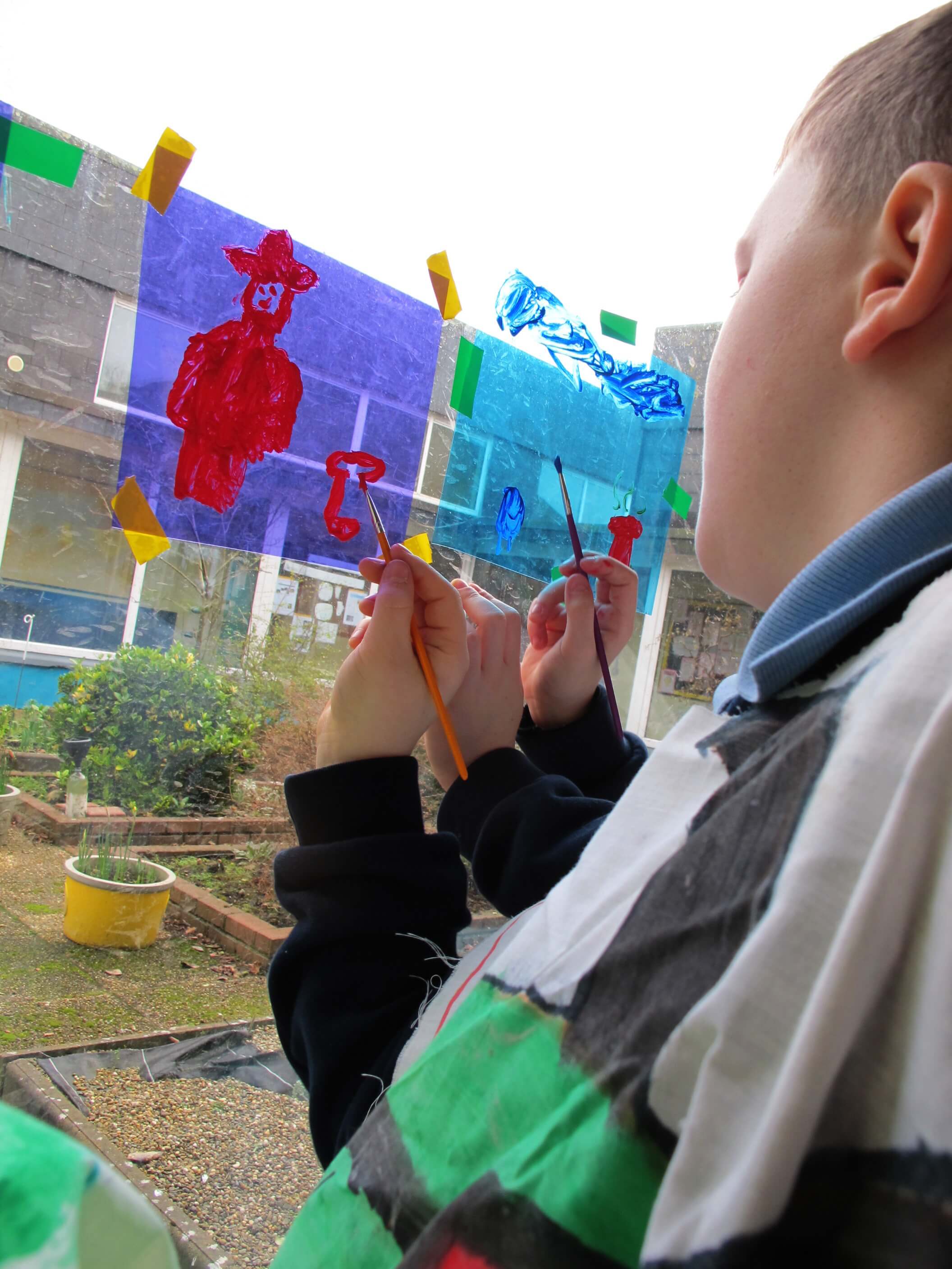 The class took these gels and placed them on the windows. Using acrylic paint, they picked out the form of objects in the garden, looking at the surface of the gel and through it to the garden they could see beyond it.