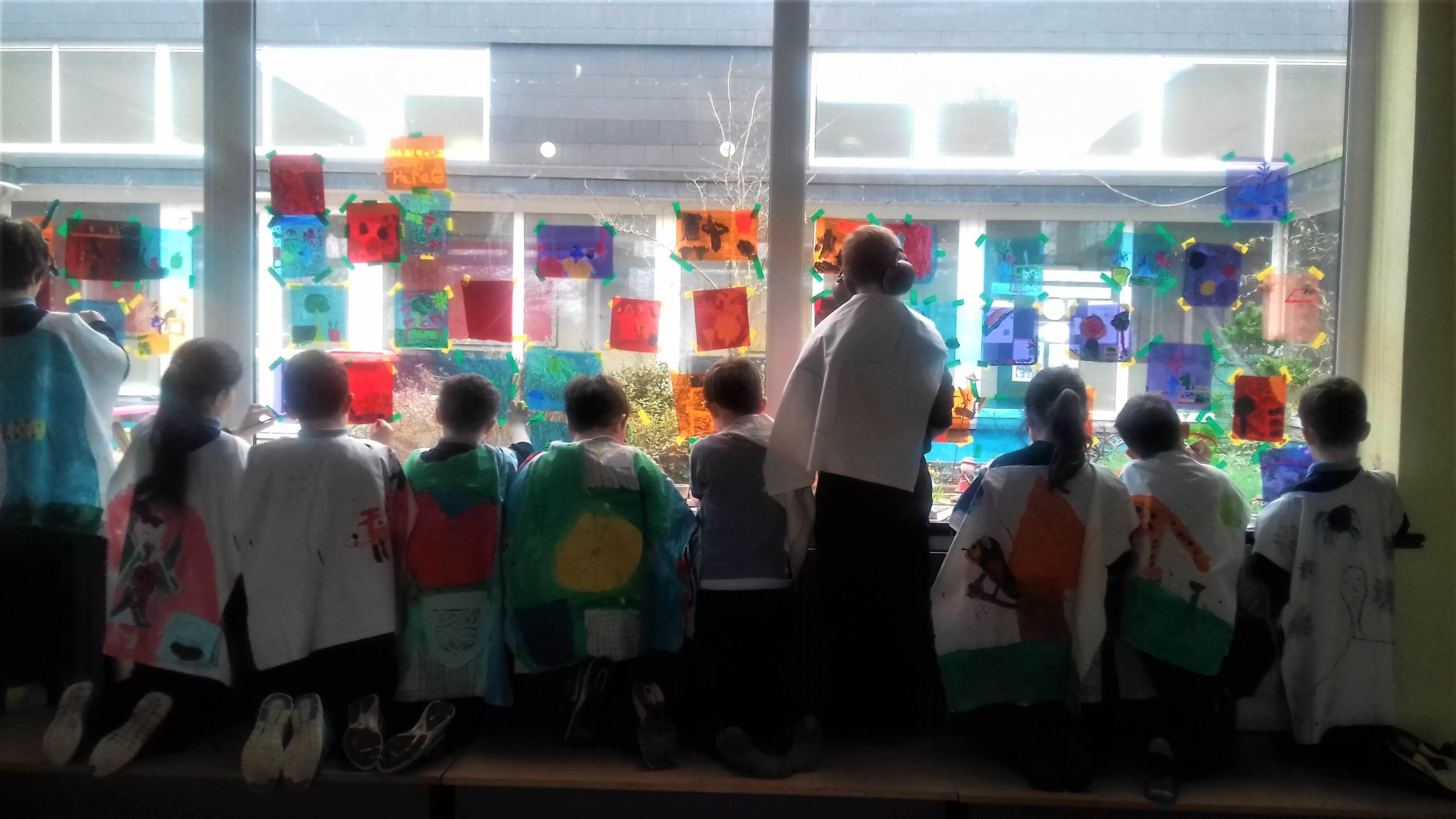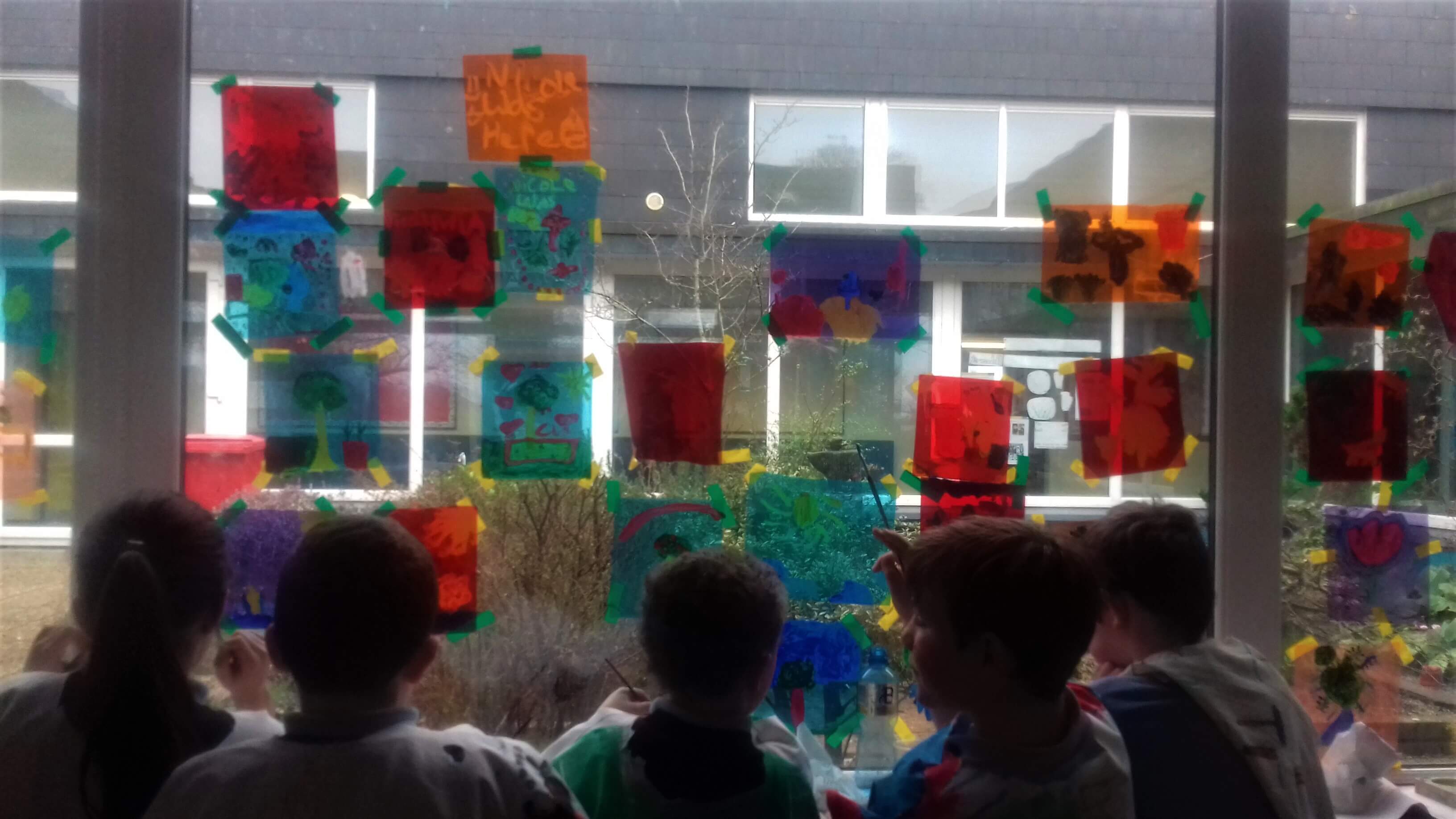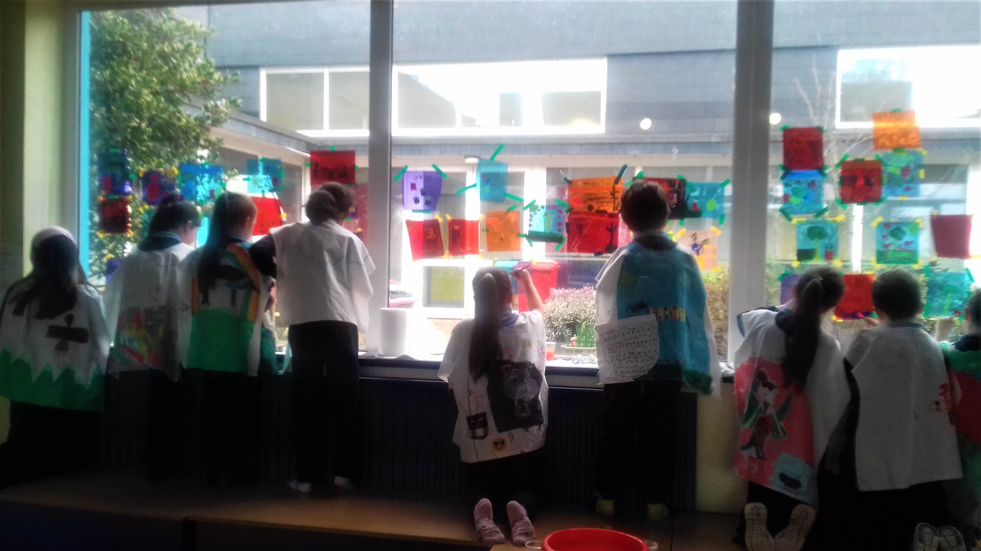 The class took these gels and placed them on the windows. Using acrylic paint, they picked out the form of objects in the garden, looking at the surface of the gel and through it to the garden they could see beyond it.