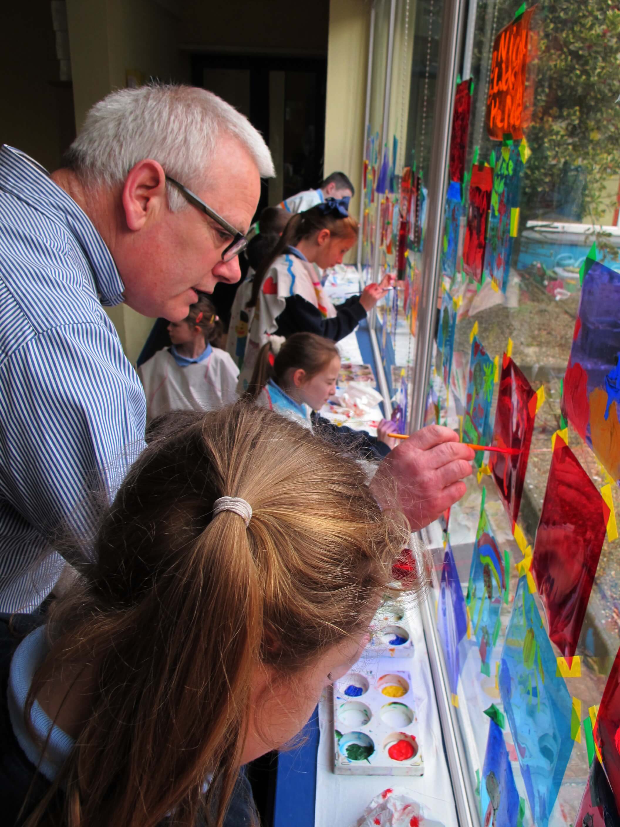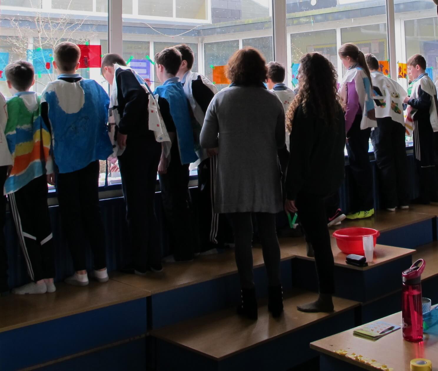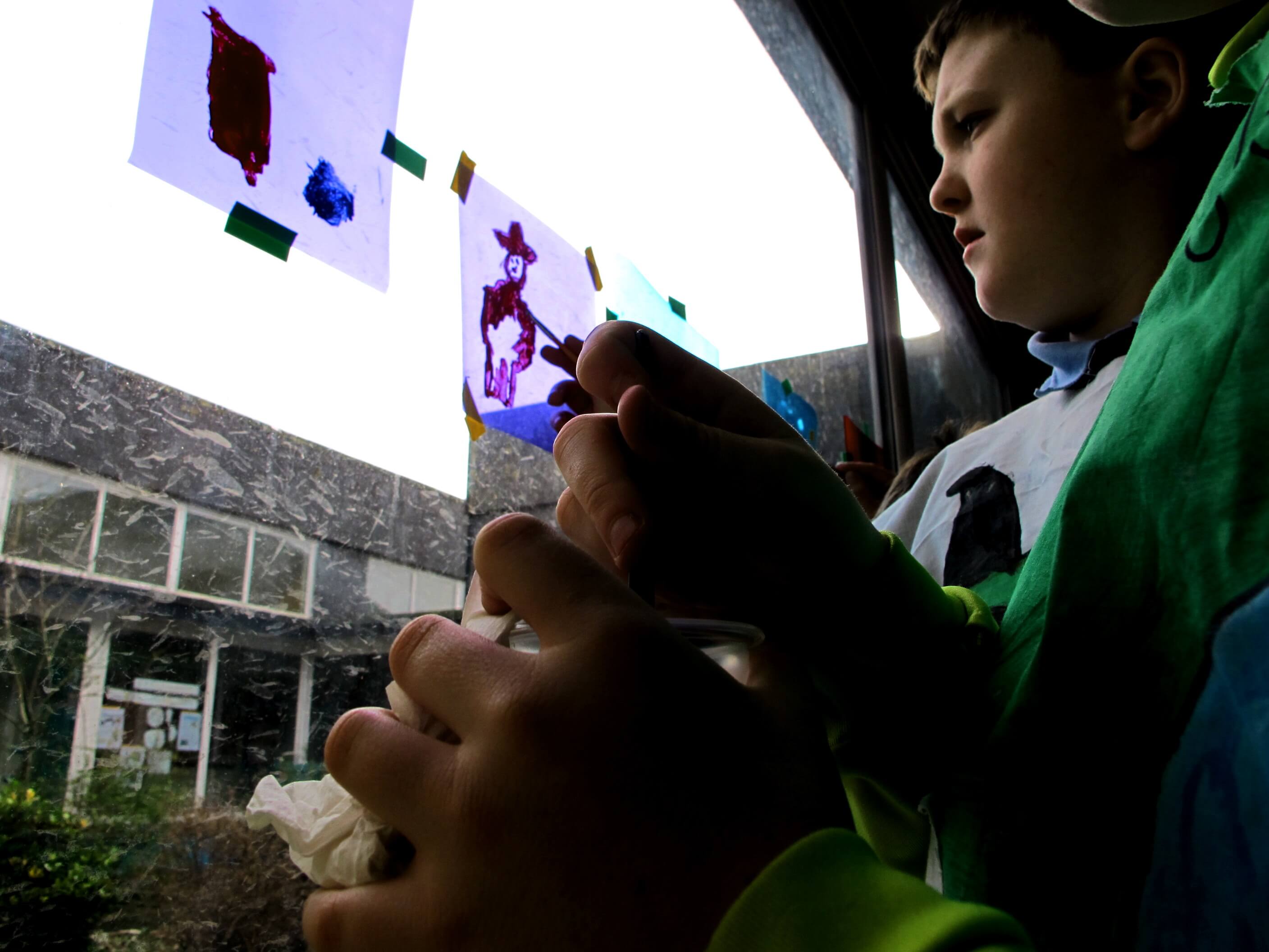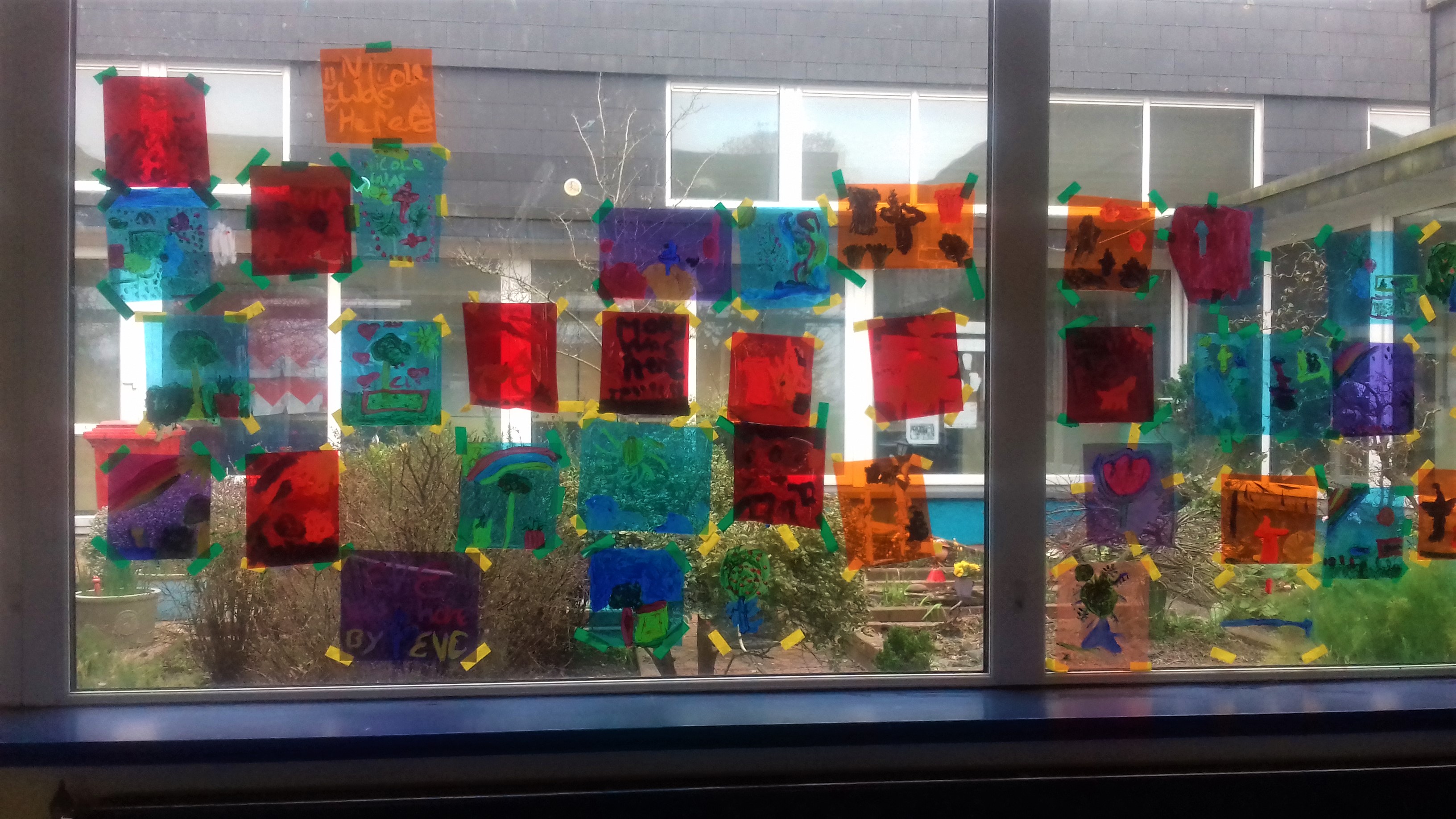 The class took these gels and placed them on the windows. Using acrylic paint, they picked out the form of objects in the garden, looking at the surface of the gel and through it to the garden they could see beyond it.