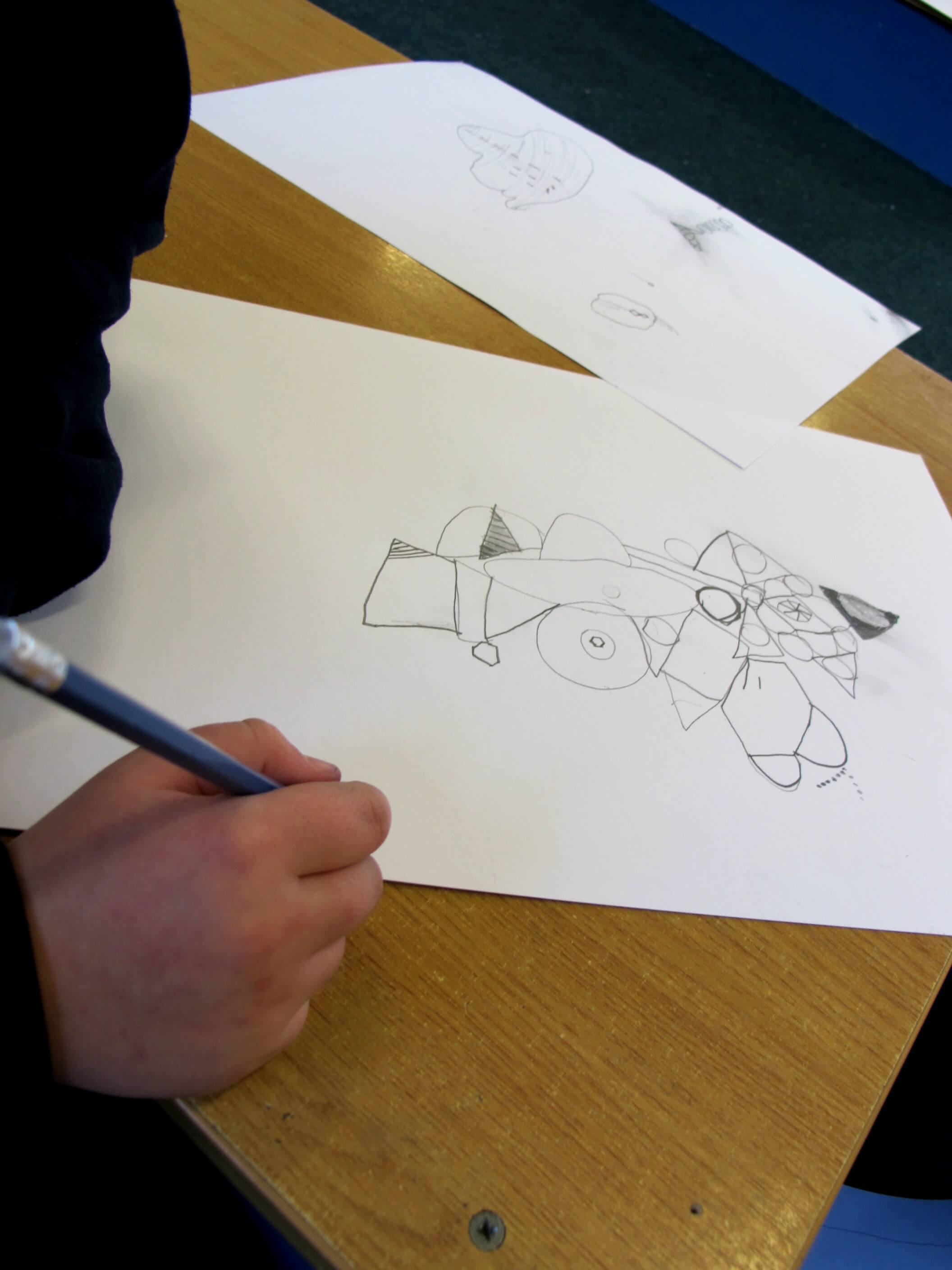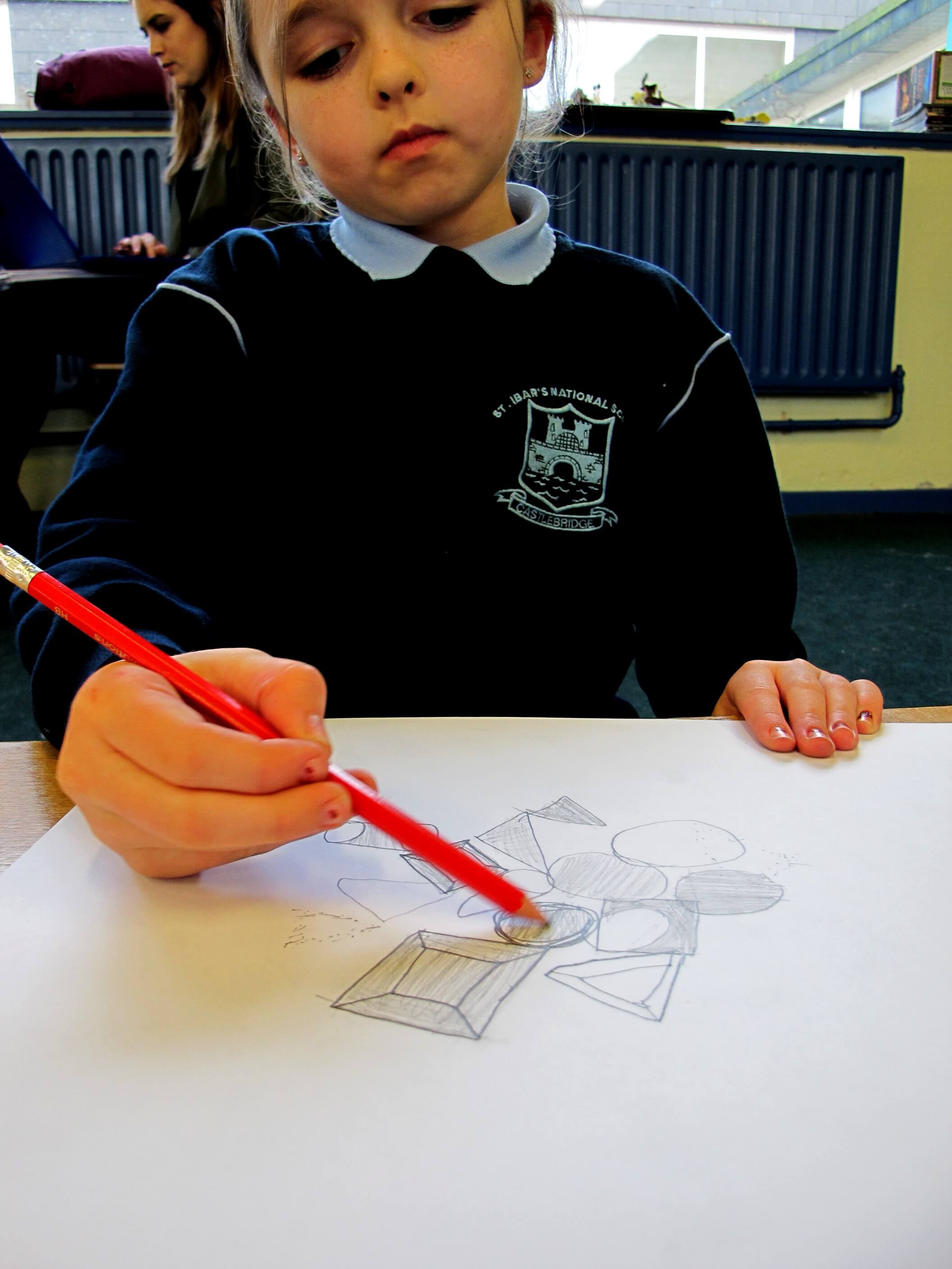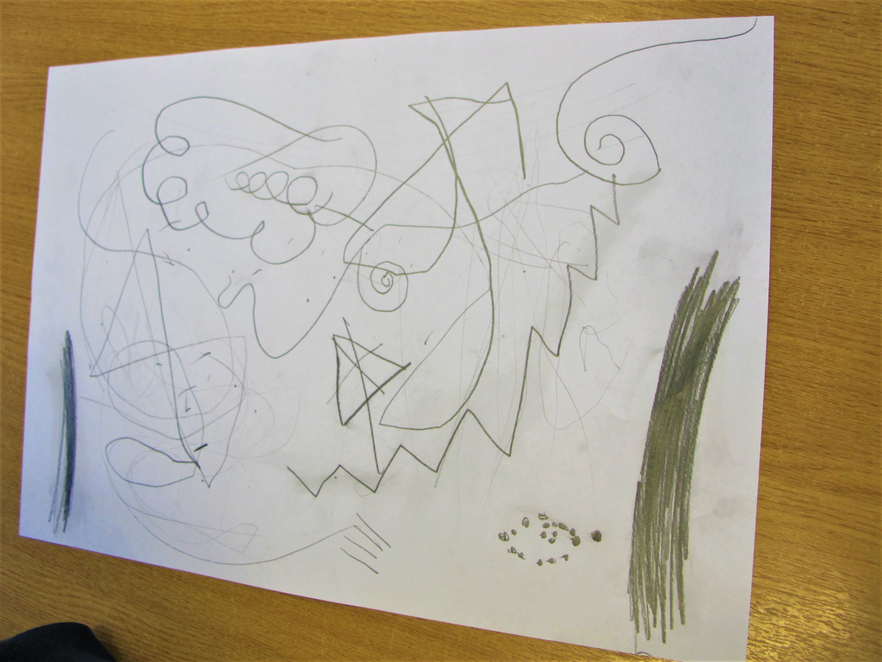 Then we looked at some raw dough and drew it. This was very different to drawing geometric shapes, these were wobbily, wiggily, soft, curved lines. The shapes curved and swerved and globbed and blobbed and were much gooier and messier than the geometric shapes. We tried to make soft lines, smudging the pencil with our fingers.