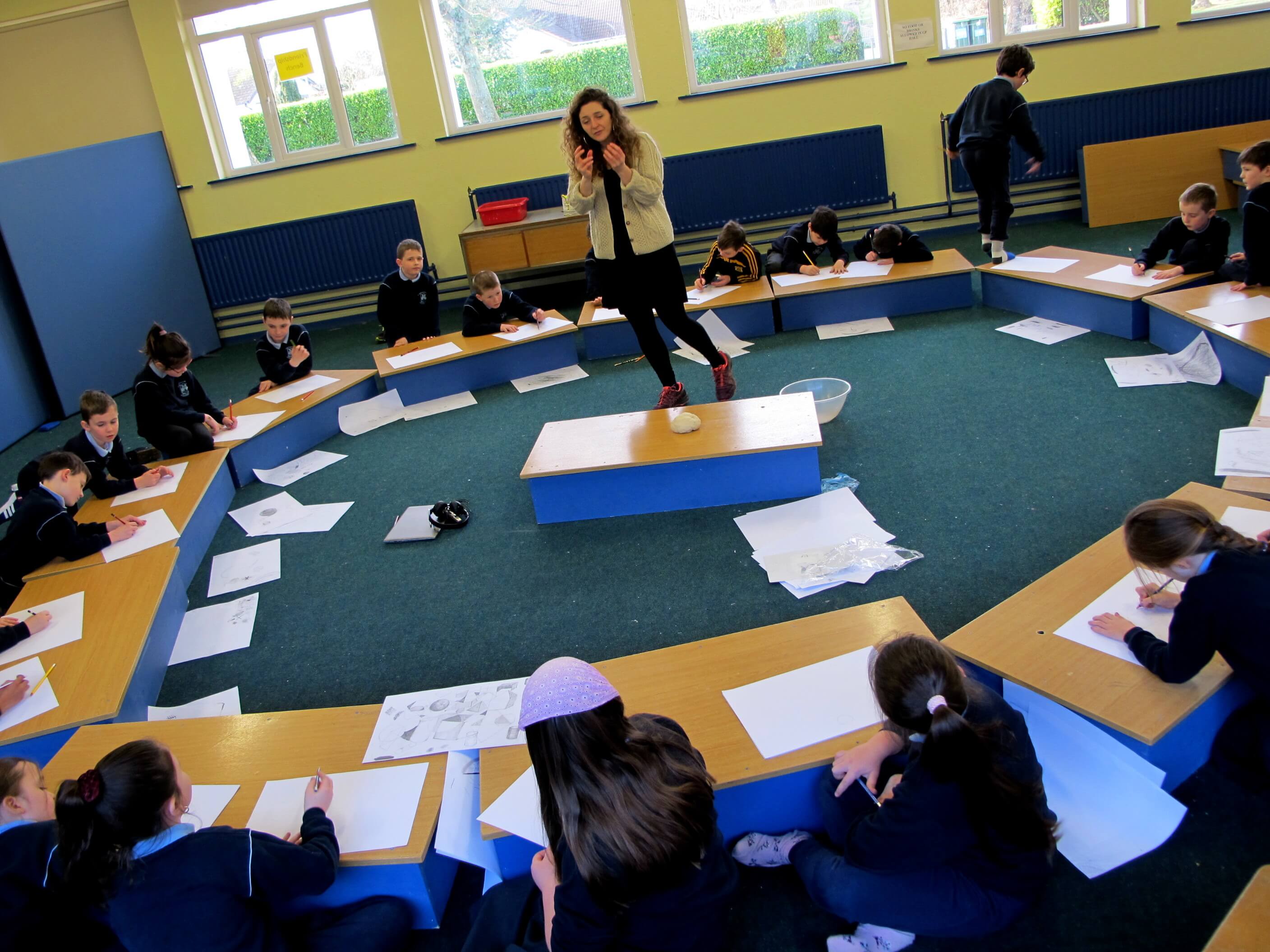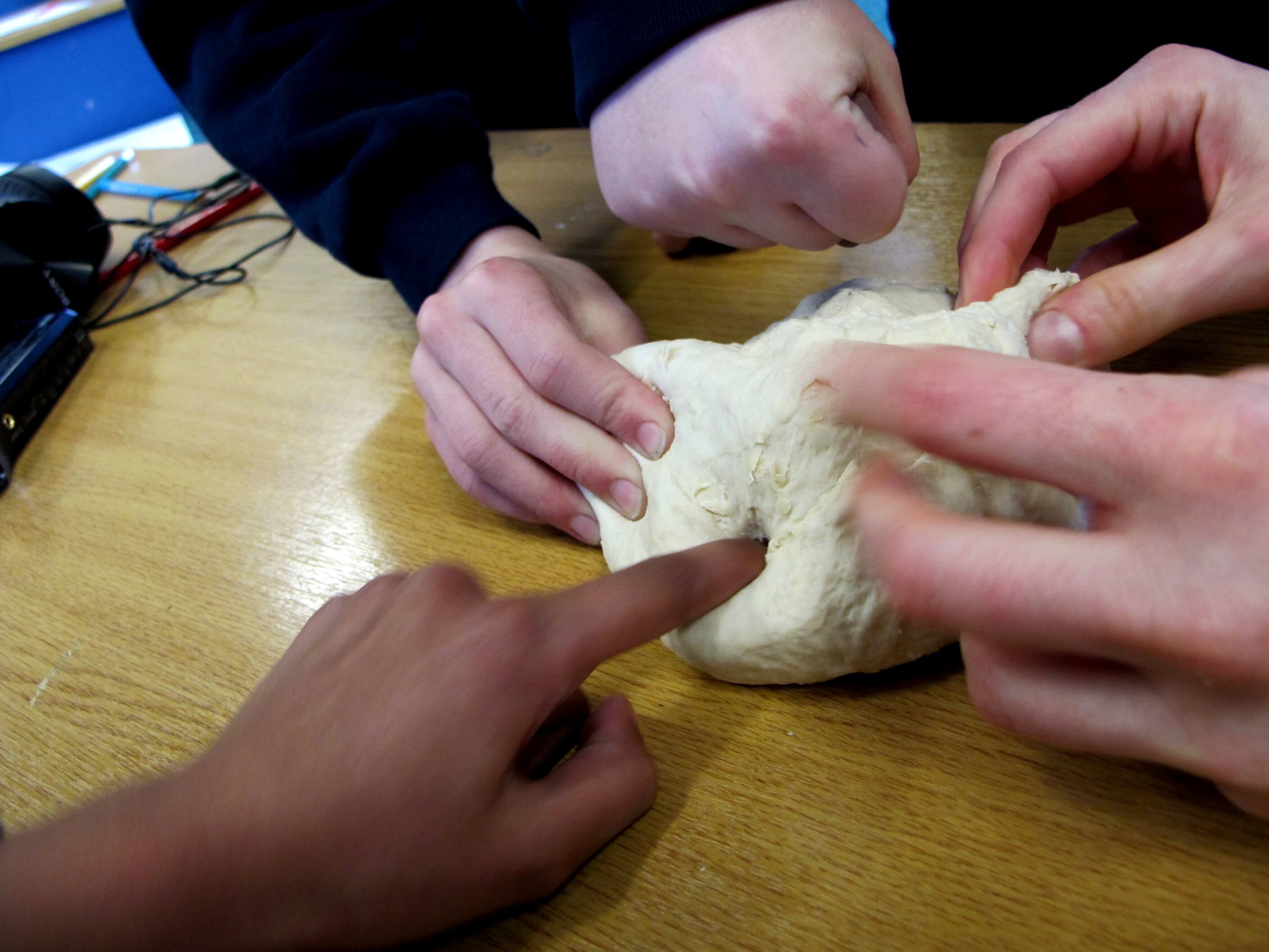 Vasiliki presents bread dough to the class as a material. Bread is made up of water, salt, flour and yeast. These are found all over the world in people's everyday life. We will explore bread dough as a material through drawing and observation.